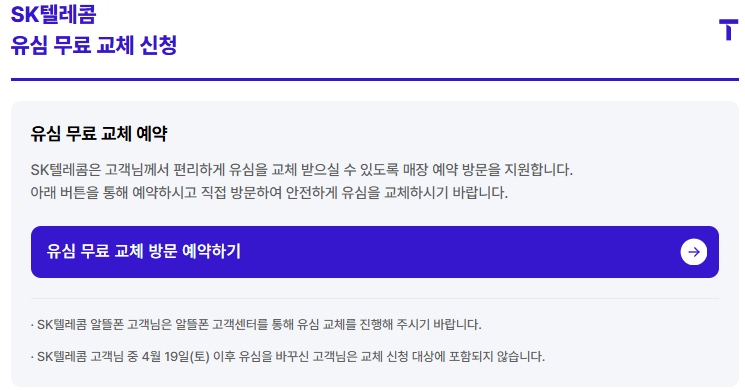 - 당일 대리점 방문이 어려운 경우, ‘유심 무료 교체 예약 시스템’(care.tworld.co.kr) 통해 사전 예약 가능
